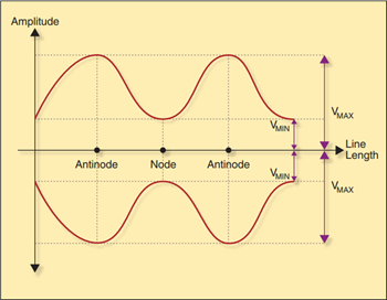 The voltage and the current along a transmission line are related by a specific ratio known as the characteristic impedance (ZO). When conducted RF energy traveling along the transmission line encounters a load equal to the characteristic impedance, all of the available power is delivered to the load. Any discontinuity (mismatch) along the transmission line that changes the load impedance causes reflected currents and voltages along the line, creating a standing wave. Incident and reflected waves interfere constructively and destructively resulting in maximum (Vmax) and minimum (Vmin) as shown in Figure 1. Voltage standing wave ratio (VSWR), a measure of this mismatch, is defined as a ratio of Vmax/Vmin.