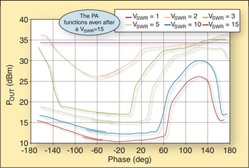 Figure 8. A GSM PA at 900 MHz is functional even after exposure to a VSWR > 15:1 when equipped with a VSWR detection and protection apparatus using directional couplers and dual log detector.
