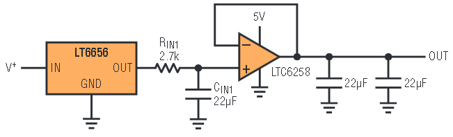 Figure 1 shows the configuration. First, a very low cutoff frequency follows the LT6656 output (RIN1 and CIN1, lower than 5Hz cutoff). Large values of RIN1 can develop significant offset voltage due to the LTC6258’s input bias current. Setting RIN1 to 2.7kΩ produces an offset that is lower than the nominal input offset voltage of the op amp. CIN1 can be larger or smaller, with more or less filtering accordingly. The voltage withstanding requirement of CIN1 is low, resulting in relatively large capacitance in a small volume.