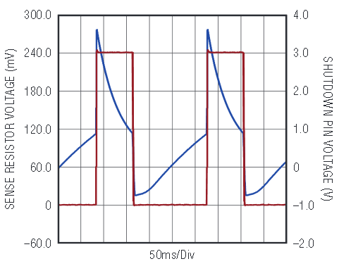 Figure 10 shows the sense resistor voltage and the SHDN pin voltage. The SHDN voltage is tied to VC; the gate drive couples through C2 as previously described.