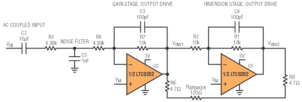 Given a 3.3V supply and the output of one LTC6261 amplifier, there may not be sufficient drive capability to yield 100mW. However, the combination of two 180° phased amplifiers is enough to provide the necessary drive to reach upwards of 100mW delivered power. Duplication of this bridge drive circuit enables power to both left and right sides. Figure 17 shows the driver schematic.