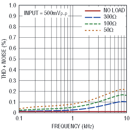 Figure 18. LTC6262 bridge driver THD and noise with different loads vs frequency.