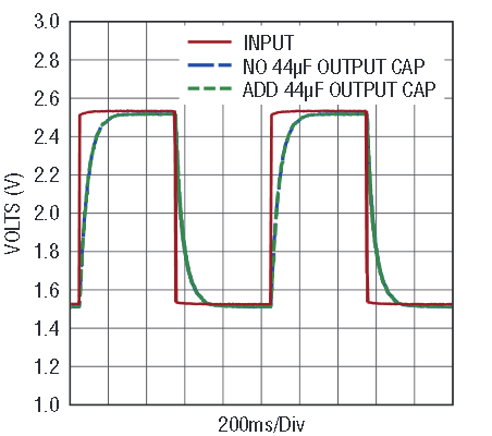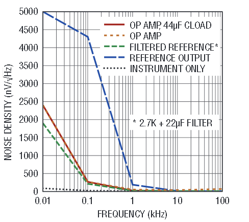 Voltage spectral noise densities are shown in Figure 2. Greater noise from the reference below 10kHz drops down once a filter (RIN1 and CIN1) follows the reference. The op amp, configured in unity gain, with or without a large 44μF load, remains stable and contributes only a small amount of low frequency noise. Figure 3 shows the transient response of the combination of RIN1 – CIN1 filter and op amp circuit, with and without the 44μF output capacitor.