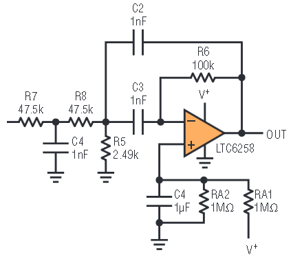 The bandpass filter of Figure 4 is AC coupled to an input. As a result, the LTC6258 input does not place a burden on the previous stage to develop a particular absolute common mode voltage. A simple resistor divider with RA1 and RA2 provides biasing for the LTC6258 bandpass filter. Pegging the op amp inputs to a fixed voltage helps to reduce distortion that might arise with moving common mode.
