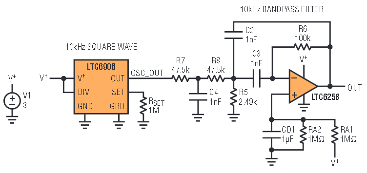 A low power sine wave generator can be derived by driving a square wave into the bandpass filter. A complete schematic is shown in Figure 6. The LTC6906 micropower resistor set oscillator easily configures as a 10kHz square wave, and can drive the relatively benign loading seen in the bandpass filter input resistors. Supply current of the LTC6906 at 10kHz is 32.4μA.