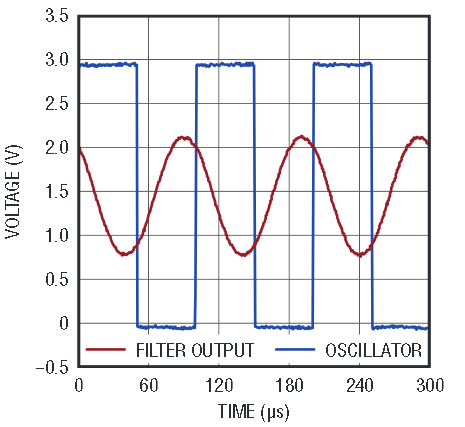 Figure 7 shows the LTC6906 output and bandpass filter output. HD2 of the sine wave is −46.1dBc, and HD3 −32.6dBc. The output is 1.34VP-P to 1.44VP–P with the exact level varying slightly due to finite op amp open loop gain at 10kHz. Total current consumption is below 55μA on a 3V rail.