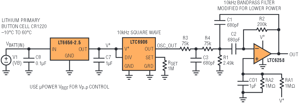 Figure 8 shows optional enhancements. A low power reference takes advantage of the ability of the LTC6906 and LTC6258 to operate on a very low supply. The reference provides 2.5V from a battery input. The fixed 2.5V supply stabilizes the output voltage swing in the presence of varying input voltage. In addition, even lower filter capacitor values with higher resistances reduce LTC6258 loading further, lowering dissipation and improving filter accuracy.