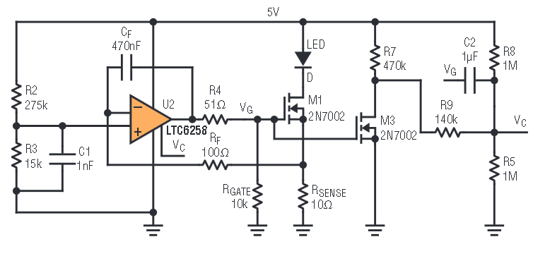 The circuit of Figure 9 combines edge detection with use of the SHDN pin of the LTC6258. C2 can AC couple any fast VG gate drive action into the signal VC. Hence, when the gate voltage of M1 increases when LED ON begins, VC suddenly rises. VC connects to the SHDN pin; a rising edge on the SHDN pin enables the LTC6258, which is already driving LED current through its feedback circuit, to stay on. However, M3 is also on while M1 is on, and as a result works with R9 to charge C2 slowly until VC falls below the SHDN threshold. At that moment, the active low shutdown kicks in, and the LTC6258 turns off. A negative falling VG voltage again feeds through C2, and a falling VC and hence a falling SHDN pin voltage keeps the circuit in an “LED OFF” state for some time. M3 turns off, and C2 discharges until VC is high enough to reactivate the LTC6258.