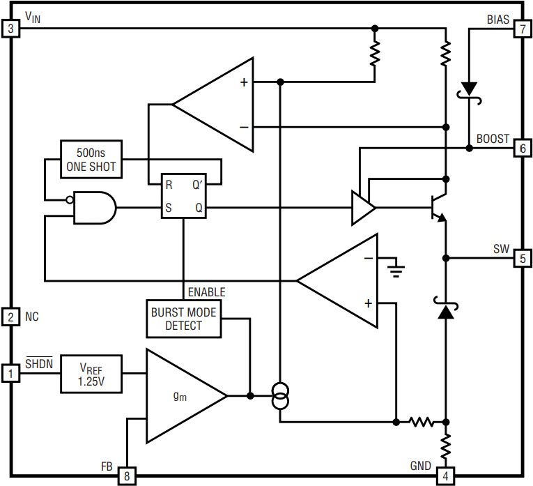 The LT3470 is a micropower buck regulator that integrates a 300mA power switch, catch diode and boost diode into a low profile 8-Pin ThinSOT package (see Figure 1). The combination of single cycle Burst Mode and continuous operation allows the use of tiny inductor and capacitors while providing a low ripple output to loads of up to 200mA. With its wide input range of 4V to 40V and low quiescent current of 26µA (12V in to 3.3V out) the LT3470 can regulate a wide variety of power sources, from 2-cell Li-Ion batteries to unregulated wall transformers and lead acid batteries.