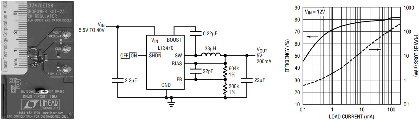 Figure 2. The LT3470 uses a minimum of board space and external components while delivering wide onput range and high efficiency. This buck regulator supplies up to 200mA at 5V from inputs up to 40V. Input power loss is below 1mW when there is no output load.