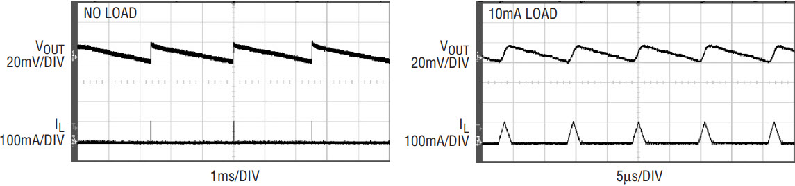 Figure 3. Operating waveforms show the output voltage ripple remains at 10mV in BurstMode operation, while requiring only a 22µF ceramic output capacitor.