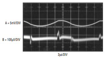 Figure 4. Waveforms for Figure 3 at 10W output: Trace A shows fundamental ripple with higher frequency residue just discernible. The optional LC section results in Trace B’s 180µVP-P wideband noise performance.