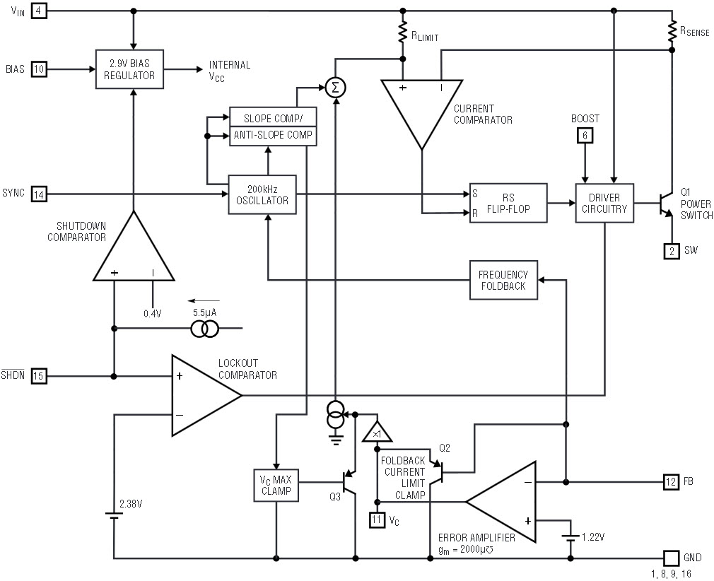 The LT1766 is packaged in a 16-pin SSOP (GN-16) package, which occupies the same space as an SO-8 package. The LT1766 provides a wide range of functions, such as undervoltage lockout and micropower shutdown, along with external synchronization capability, without sacrificing the power saving features of a BIAS or BOOST pin. Also, the GN-16 package, with its fused corner pins, improves thermal performance, reducing the θJA of the package from 120°C/W (typical SO-8) to 95°C/W.