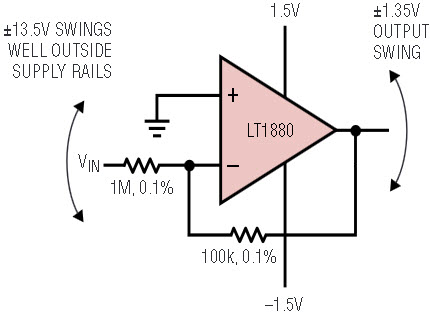 The circuit of Figure 2 shows an extreme example of the inverting case. The input voltage at the 1M resistor can swing ±13.5V and the LT1880 will output an inverted, divided-by-ten version of the input voltage. The input accuracy is limited by the resistors to 0.2%. Output referred, this error becomes 2.7mV. The 40µV input offset voltage contribution, plus the additional error due to input bias current times the ~100k effective source impedance, contribute only negligibly to error.