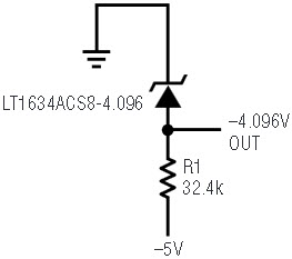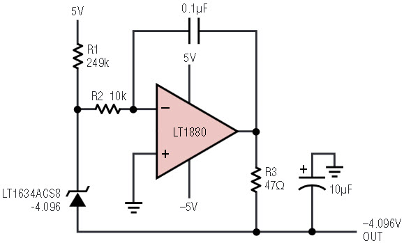 Figure 5. Simple, precision –4.096V reference: output is not buffered. PSRR is compromised by low value of R1.