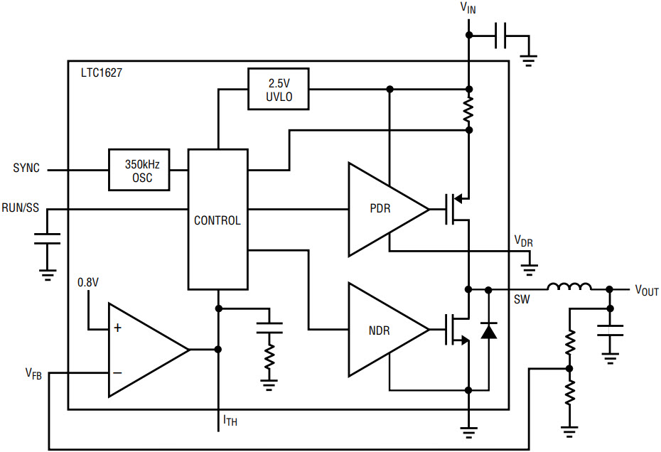 The internal oscillator is set for a fixed switching frequency of 350kHz, allowing the use of small surface mount inductors. In switching-noise-sensitive applications, the LTC1627 can be externally synchronized to frequencies of up to 525kHz. During synchronization, Burst Mode operation is inhibited and pulse-skipping mode is used. In this mode, when the output load is very low, the current comparator remains tripped for more than one cycle and forces the main switch to stay off for the same number of cycles. Increasing the output load slightly allows constant frequency PWM operation to resume.
