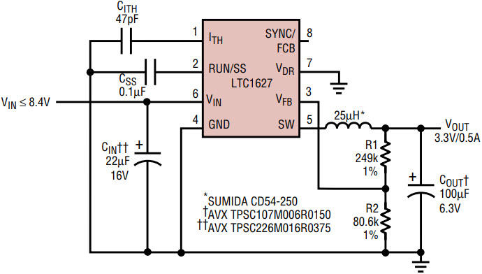Figure 7 is a schematic diagram showing the LTC1627 being powered by one or two Li-Ion batteries. All the components shown in this schematic are surface mount and have been selected to minimize the board space and height. The output voltage is set at 3.3V, but is easily programmed to other voltages.