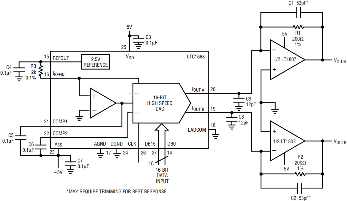 Figure 1. LTC1668 current output DAC followed by two 200Ω I/V converters using the LT1807.