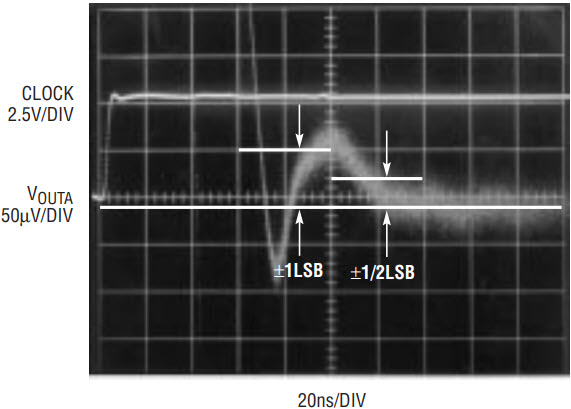 With a 2V output swing, 16-bit resolution dictates an error band (±1LSB) of 60µV. We evaluated the circuit’s single-ended settling time according to the methods described in LTC Application Notes AN74 and AN79. The results are shown in Figure 2, with settling time measuring less than 90ns. Reducing the error band to ±1/2LSB moves the measured settling time out to just inside 120ns, at which point the effects of the transient are clearly finished. Persistence over a 500ns window was excellent but, although no longer settling tails were seen, the circuit was not intended or fully characterized for longer term 16-bit precision.