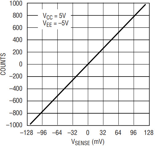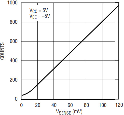 Connecting the optional section of the schematic (still operating the circuit from a single supply) allows the A/D’s reference to “bias up” the LT1787 exactly as shown in Figure 5. Of course, the graph of the output would then be recast as similar to Figure 11 (counts versus VSENSE).