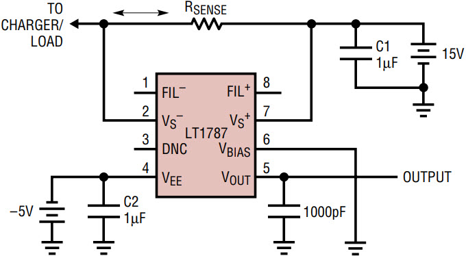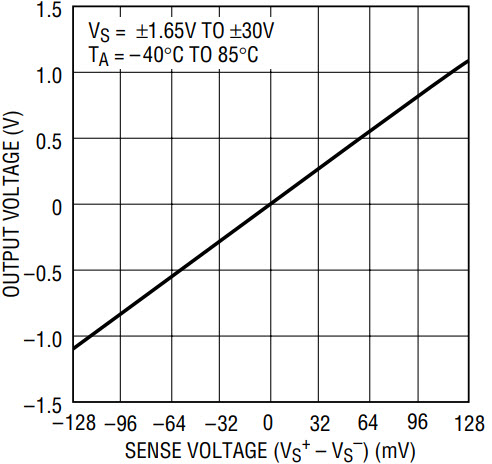 The LT1787 allows the use of a user-selectable sense resistor, the value of which depends on the current to be monitored. This allows the input voltage to be optimized to the 128mV value, maximizing dynamic range. The part has a fixed voltage gain of eight from input to output.