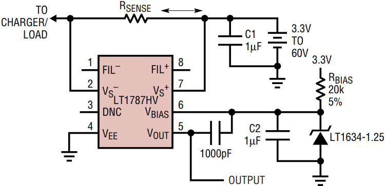 The LT1787 is a precision, high-side current sense amplifier designed for monitoring of the current either into or out of a battery or other element capable of sourcing or sinking current. The LT1787 features a miniscule 40µV (typical) input offset voltage with a 128mV full-scale input voltage. (The part is generally used at ±128mV full-scale, although it is specified for 500mV minimum full-scale.) This translates to a 12-bit dynamic range in resolving currents. A hefty 60V maximum input voltage specification allows the part to be used not only in low voltage battery applications but also in telecom and industrial applications where higher voltages may be present.