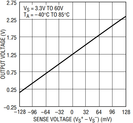 Figure 2 shows the schematic diagram of the LT1787 operated with dual supplies. This circuit can sense current in either direction, positive current flow being from VS+ to VS–, where the output ranges from 0V to 1.024V for VSENSE = 0mV to 128mV, and negative current flow being from VS– to VS+, where the output varies from 0V to –1.024V for VSENSE = 0mV to –128mV. Figure 3 shows the output voltage versus VSENSE for this configuration.