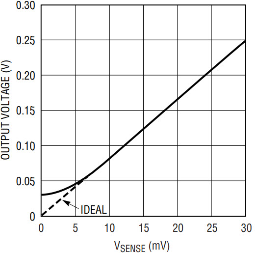 Figure 9. Expanded scale of VOUT vs VSENSE, unidirectional current sensing mode.