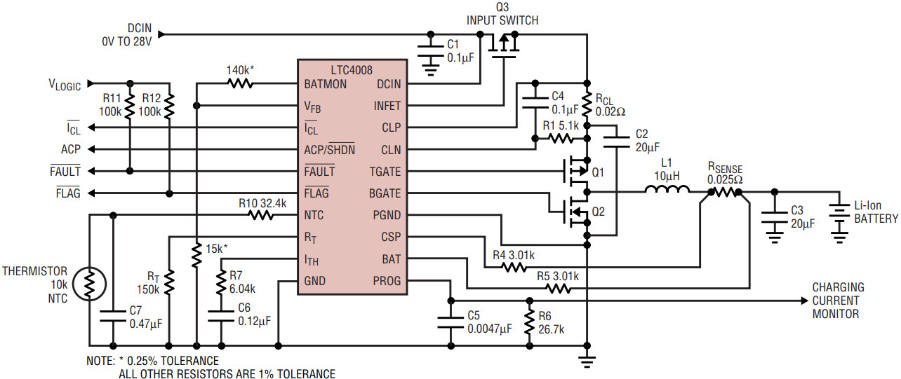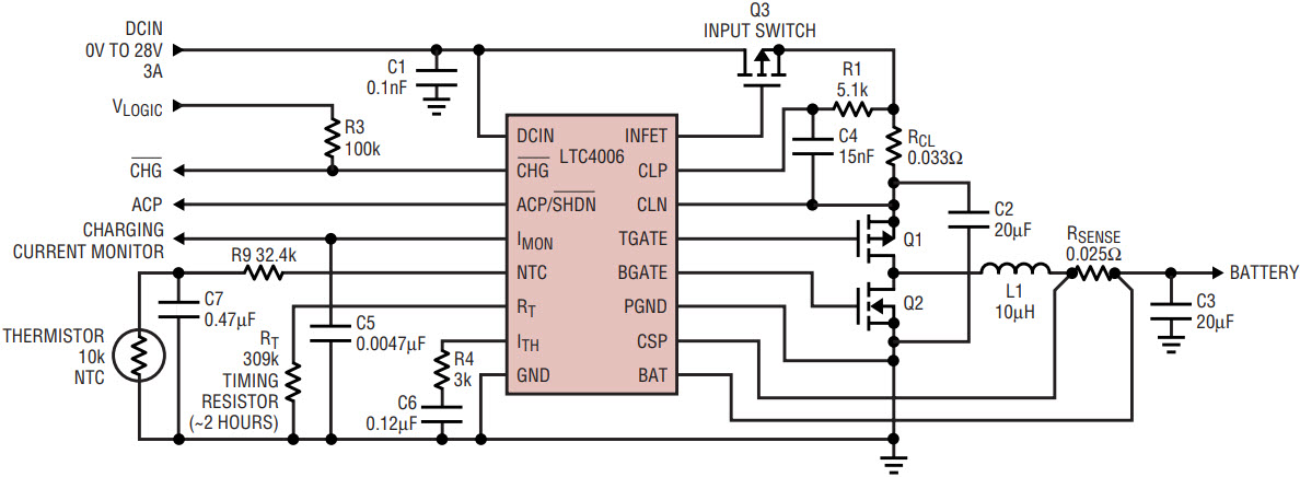 Traditionally, high current chargers require a large number of external support components, but the LTC4006, LTC4007 and LTC4008 offer features to push solution size down.