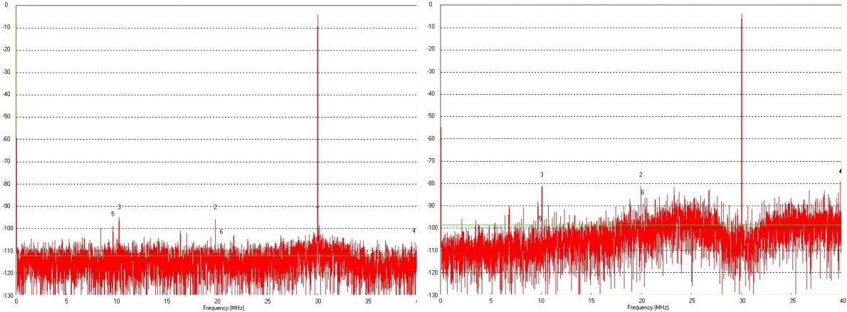 除由于时钟抖动而增加的噪声以外,时钟信号中与时钟不存在谐波关系的谱线也将显现为数字化输出的失真。因此,时钟信号应具有尽可能高的频谱纯度。欲了解有关孔径抖动效应的更多详细信息,请参考ADI应用笔记AN-501和AN-756。