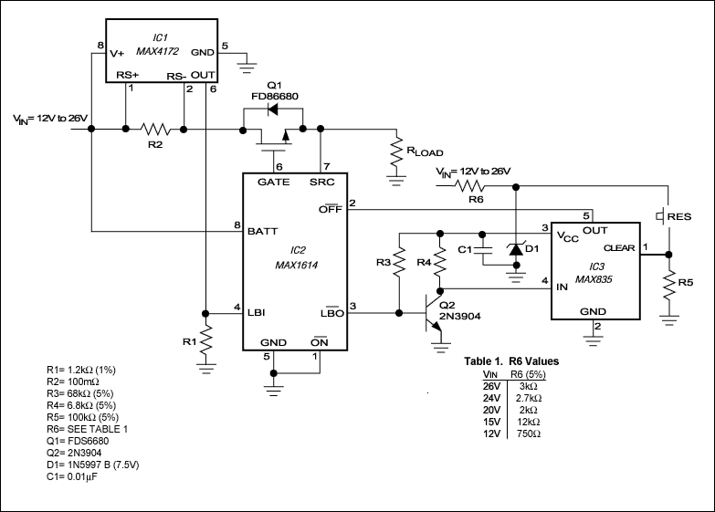 R1 in the figure was chosen for a trip current of 1A, but values to 10A are acceptable. Supply current at the trip level produces a voltage across R1 that triggers the "low-battery" comparator in IC2 (a high-side, N-channel MOSFET driver). The comparator output (LBO) turns on Q2 to saturation, causing the latched output of IC3 (a micropower voltage monitor) to go low. Applied to IC2's pin 2, this signal disconnects the power by turning off Q1.