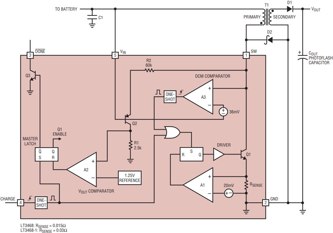 To better understand the operation of the part, refer to Figure 3 for the following overview. Note that the only difference between the LT3468 and the LT3468-1 is the switch current limit (1.4A for the LT3468, 0.7A for the LT3468-1). A low-to-high transition on the CHARGE pin initiates the part. An edge triggered one-shot triggered by the CHARGE pin puts the various latches inside the part into the proper state.