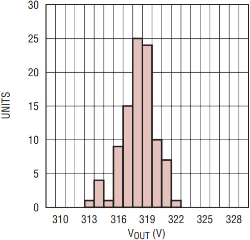Because most of the output detection circuitry, other than the transformer, is integrated inside the IC, the accuracy of the output detection can be very good. The 31.5V comparator voltage is precision trimmed and is specified at ±1.6% over the full operating temperature range. To find the worst case deviation on the output voltage, simply add this deviation to the worst case deviation in the turns ratio N of the transformer. Typical guaranteed deviations of N are in the 2%–3% range, although there is likely much room for improvement here. Consult your transformer vendor for more information. Figure 5 shows a histogram of the VOUT distribution for a sample (~100 units) of LT3468 prototype boards. As you can see, the distribution is tight in a range of ±5V, which is equivalent to a tolerance under ±1.5%.
