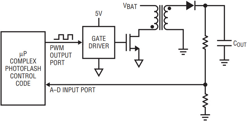Figure 6. Typical microprocessor-controlled flyback photoflash capacitor charger. Due to cost and microprocessor limitations, no sensing of primary current is done—only the output voltage is sensed in order to halt charging at the appropriate time.