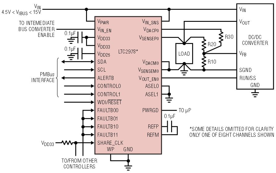 With its unprecedented parametric accuracy, rich feature set, and modular architecture, the LTC2978 is an ideal solution for managing large arrays of DC/DC POL converters.