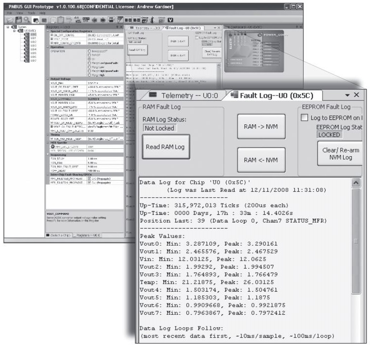 Figure 5. The LTC2978 comes with free software that allows easy data monitoring and cofiguration. The data log shows monitor readings just before a failure for debugging analysis.