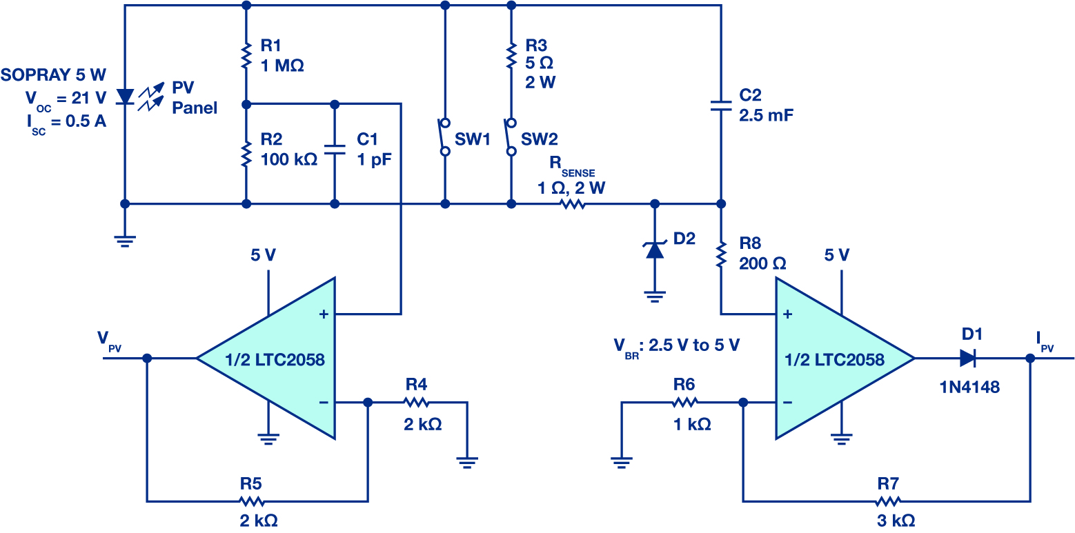 图 1 示出了一款用于对 PV 模块进行特性分析的 I-V 扫描方法实施方案。C2 是主容性负载,其大小的选择需在测量速度和准确度之间进行权衡:当选择较小的电容器 C2 时,扫描速度较快,可降低出错的风险;选择较大的电容器 C2 时,则扫描速度较慢,同时可完成更精确的测量采样。