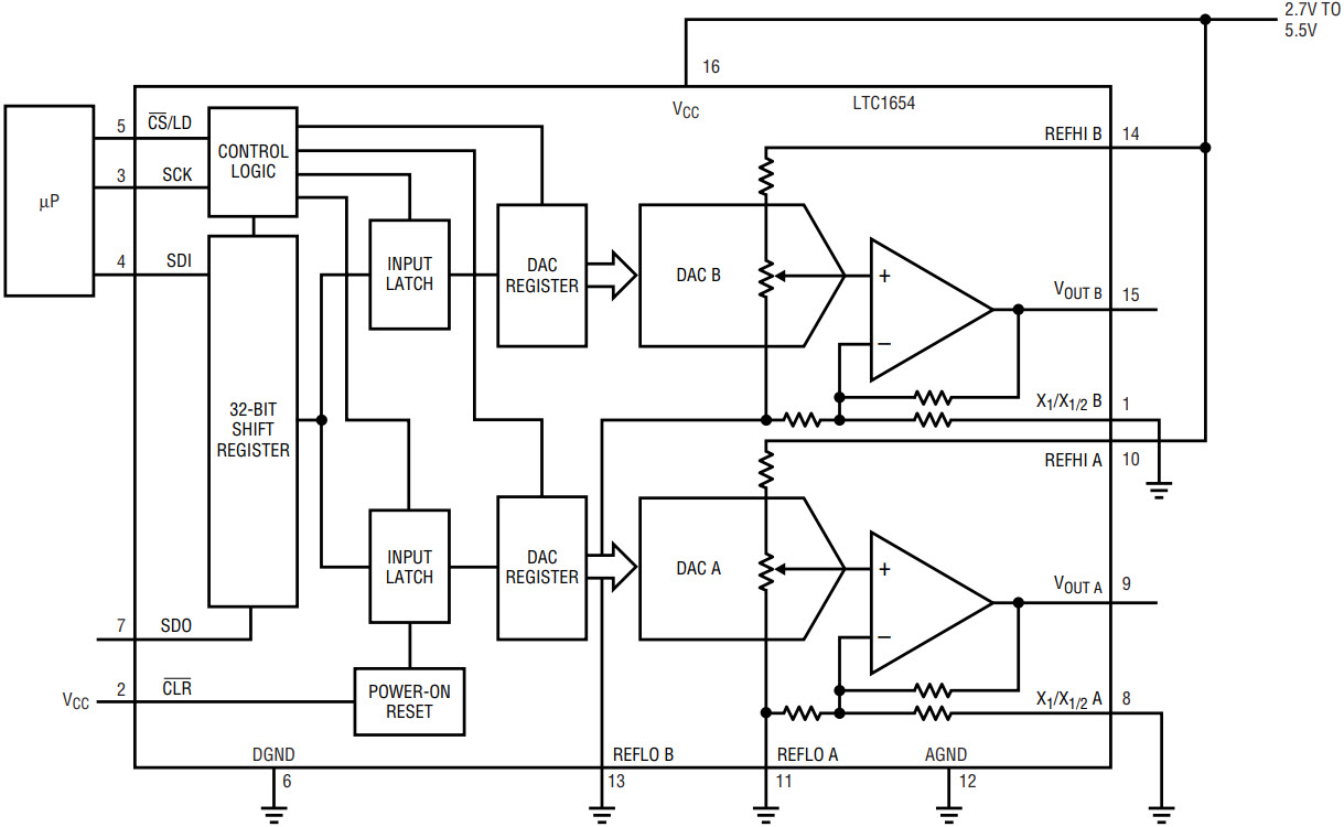 The LTC1654 has separate REFHI and REFLO pins for each DAC and two different gain modes. A gain of one is set by connecting the X1 /X1/2 pin to REFLO and a gain of one-half is set by connecting this pin to VOUT. The two different gain modes allow the user to set different output spans. The REFHI inputs have an operating range from ground to VCC and the REFLO inputs have an operating range from ground to VCC – 1.5V. A block diagram of the part is shown in Figure 1.