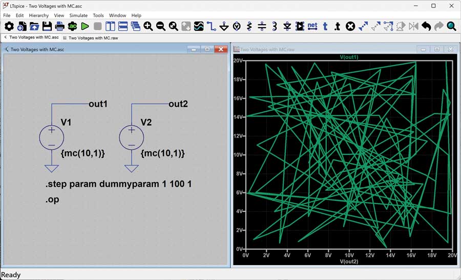 Observe what this mc() function is doing during each step iteration: Figure 2 shows a simpler example using a voltage source only. This example uses mc() to set the nominal voltage to 10 V and the tolerance at 100%, so a uniform distribution between 0 V and 20 V is expected. From the results in the waveform viewer and in the SPICE output log, notice that for 10 iterations, the voltage varies from 2.7 V to 19.92 V, and the distribution isn’t entirely uniform, but more iterations would help to ensure that these results are more statistically sound.