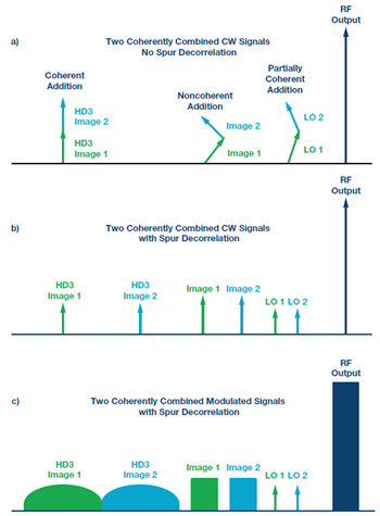为了从频率角度说明概念,图3展示了一个带有来自直接变频架构的两个发送信号的示例。在这些示例中,射频位于LO的高端。在直接变频架构中,镜像频率和三次谐波出现在LO的相对侧,并显示在LO频率下方。当将不同通道的LO频率设置为相同的频率时,杂散频率也处于相同的频率,如图3a所示。图3b所示为LO2的设置频率高于LO1的情况。数字NCO同等地偏移,使RF信号实现相干增益。镜像和三次谐波失真积处于不同的频率,因此不相关。图3c所示为与图3b相同的配置,只是RF载波添加了调制。