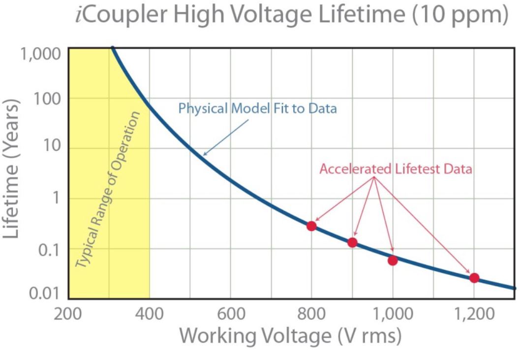 iCouplerHVE寿命取决于施加的电压是交流还是直流电压。在直流电压下,静态场会阻止能量的捕捉/重组合释放。因此,直流寿命远远长于交流寿命。iCoupler产品始终指定最差情况下的交流寿命。