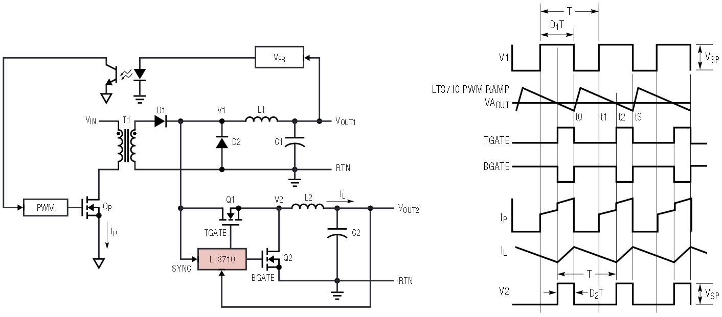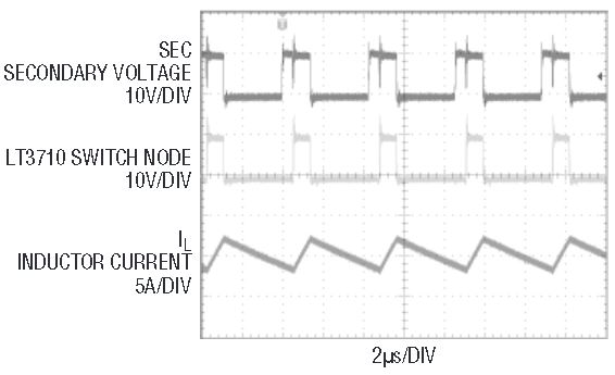 Figure 1 shows a simplified LT3710 application circuit and key waveforms. The main output power stage is a forward converter. The LT3710 regulates the auxiliary output VOUT2. The LT3710 circuit looks like a synchronous buck converter except that the input is a pulsed voltage rectified from the power transformer secondary winding.