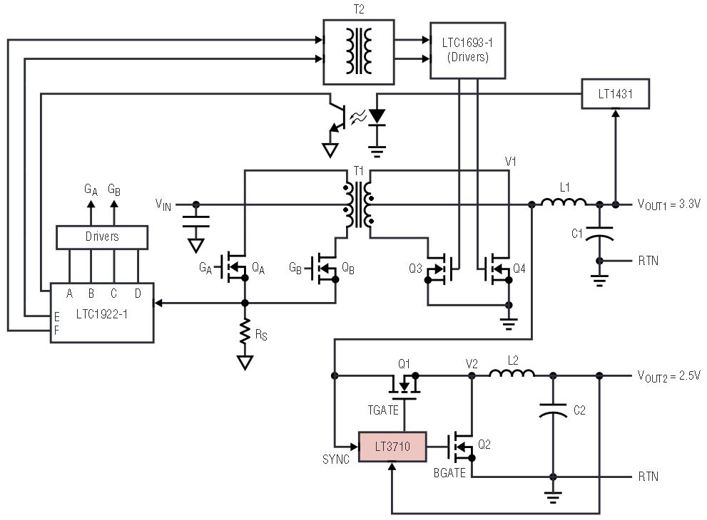 Many telecom, server and other applications require an isolated power supply with multiple output voltages, but maintaining tight regulation for all of the output voltages can be a power supply designer’s headache. Traditionally, a linear regulator is used for each auxiliary output, but efficiency of a linear regulator can be very low, limiting its usage to low output current applications. One alternative to the linear regulator is to use a buck converter as a post regulator. This method can yield better efficiency, but the power supply needs a larger output inductor and capacitor if the post regulator cascades the main output; or it needs an additional rectifier, inductor and capacitor before the post regulator if multiple secondary windings are used. The additional power conversion stage and components increase conduction losses. Another option is to use a magnetic amplifier post regulator. The efficiency of a magnetic amplifier post regulator can be high, especially for low or medium current applications, but is usually low in high current applications. Furthermore, its complex assembly and poor regulation at light load make it less than a perfect solution. A better alternative is a post regulator design that uses the new LT3710.