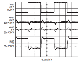 Figure 4. 1.5A to 3A to 1.5A load current step (top trace) on 2.5V output and output voltage responses (bottom traces) of circuit in Figure 1