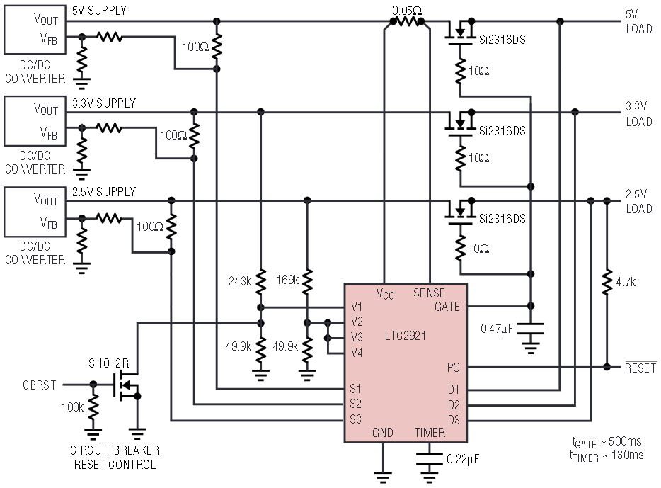 For applications where a short circuited load needs to be handled, the LTC2921 and LTC2922 provide an adjustable electronic circuit breaker. As in the case of a monitor failure, tripping the breaker deactivates power good, opens the remote sense switches, and separates the loads from the sources. Unlike the case of the monitor failure, tripping the breaker sets a latch that prevents the retry of turn-on until the latch is reset (see Figure 3).
