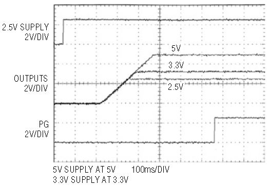 If the monitored supplies maintain correct levels, all the supplies track up together and load ramping completes. After that, remote sense switches automatically connect the load voltages to the Kelvin sense inputs of the supply sources. Sensing the load voltage allows the sources to compensate for the voltage drops across the external series FETs. Finally, activation of the power good signal indicates that ramp-up has completed. Figure 1 shows an application with three monitored tracking supplies. A scope photo of a turn-on sequence is shown in Figure 2. Table 1 summarizes the features of these devices.