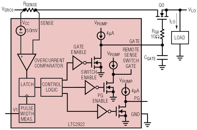 Integrated N-channel FET switches provide remote sense paths between the loads and the supply sources’ Kelvin sense pins. After the external series FETs are completely enhanced, the low resistance remote sense switches are automatically switched on, forcing the supply sources to increase enough to compensate for the series voltage drops. The LTC2921 family of parts offers three remote sense switches per package, while the LTC2922 family of parts offers five remote sense switches per package.