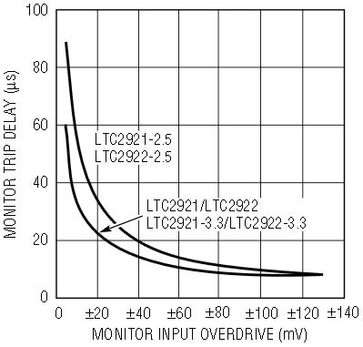 The LTC2921 and LTC2922 employ a time-integration method of filtering glitches that accommodates low energy transients on nominally DC supply voltages. For a transient to be low energy, it can have high amplitude for short duration or low amplitude for long duration. Figure 5 shows that the response time of the monitor comparators slows significantly as the input voltage nears the threshold voltage. Small voltage differences around the threshold, if they persist, trip the monitors. Large voltage spikes around the threshold, if they are short-lived, do not trip the monitors. Thus momentary load transients and electronic noise do not affect the continuous monitoring operation, but a supply voltage consistently outside of the designed range, even a small amount, does. Allowing time to factor into the threshold comparison affords glitch tolerance without degrading monitoring accuracy.