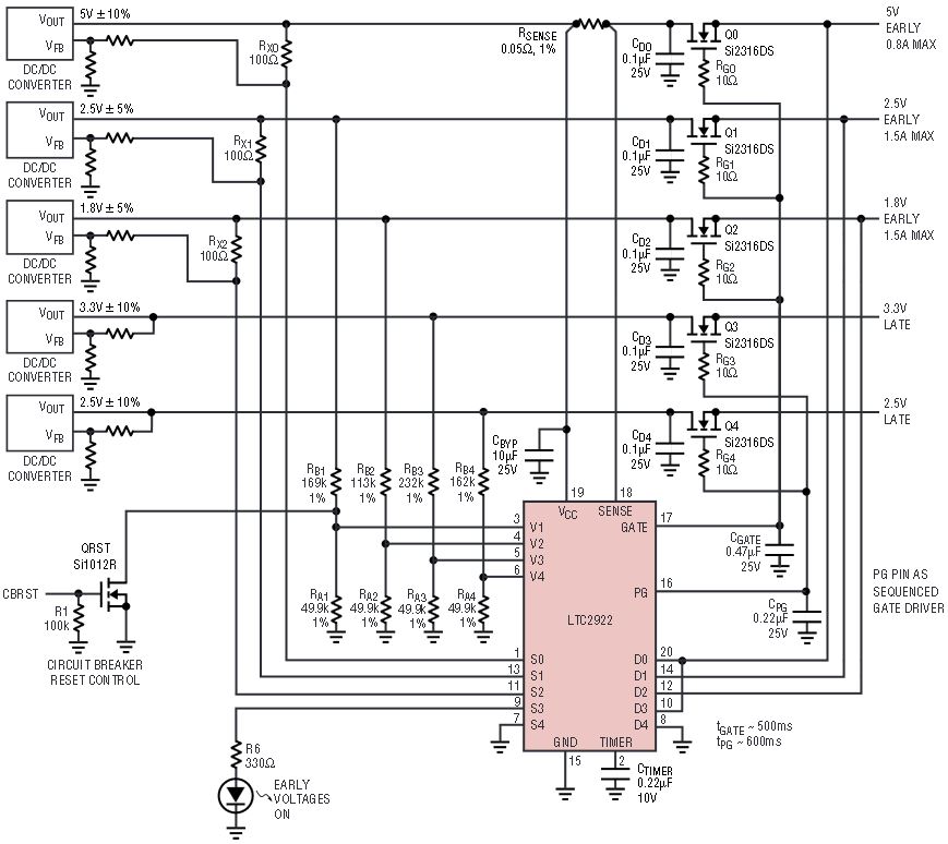 Figure 6. Supply sequencer application schematic with an LED indicating that the early voltages have turned on. Note that the late supplies do not use the remote sense switches.