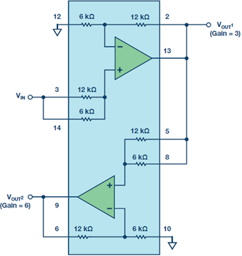 图1中的IC为AD8273,它是一款低失真、双通道放大器,内部具有增益设置电阻。利用四个已调整电阻,各通道可配置为高性能差动放大器(G = ½或2)、反相放大器(G = –½或–2)或同相放大器(G = 1½或3)。将两个放大器组合起来,可以构建一个增益可变(¼、½、1、2、3、4和6)的增益模块。该电路可以采用单电源或双电源供电,最大电源电流仅为5 mA。